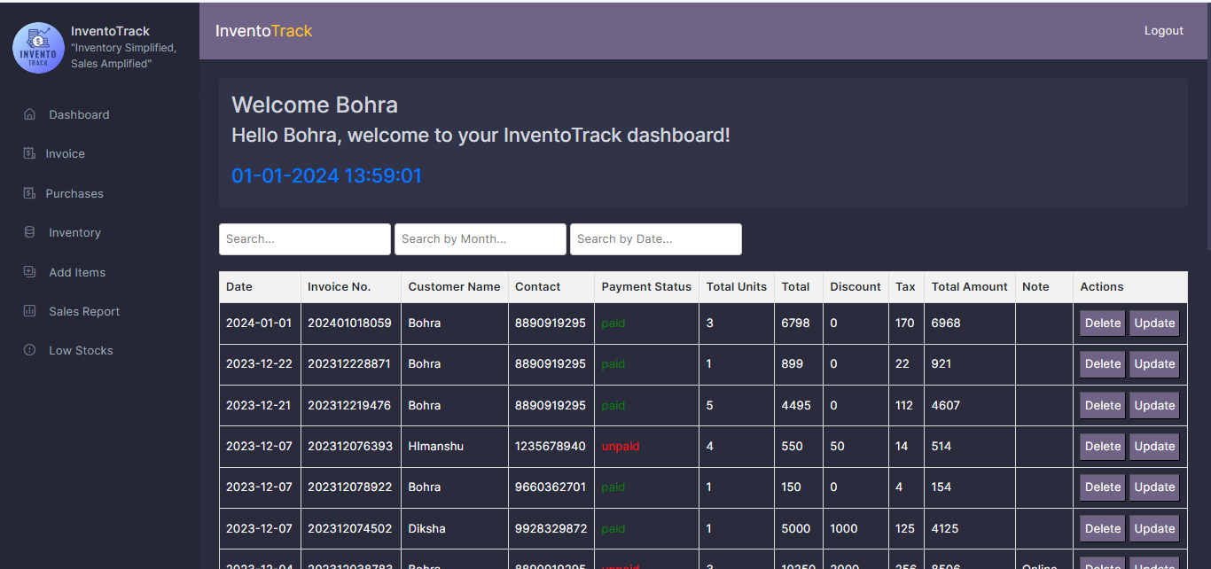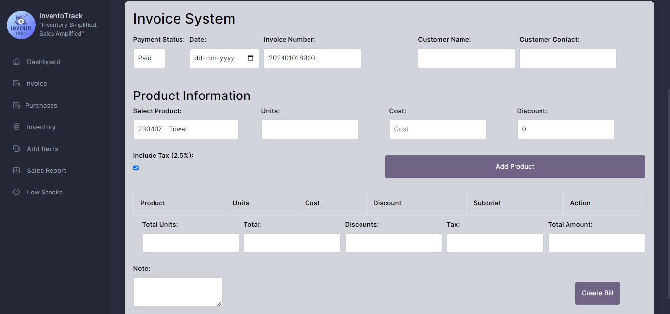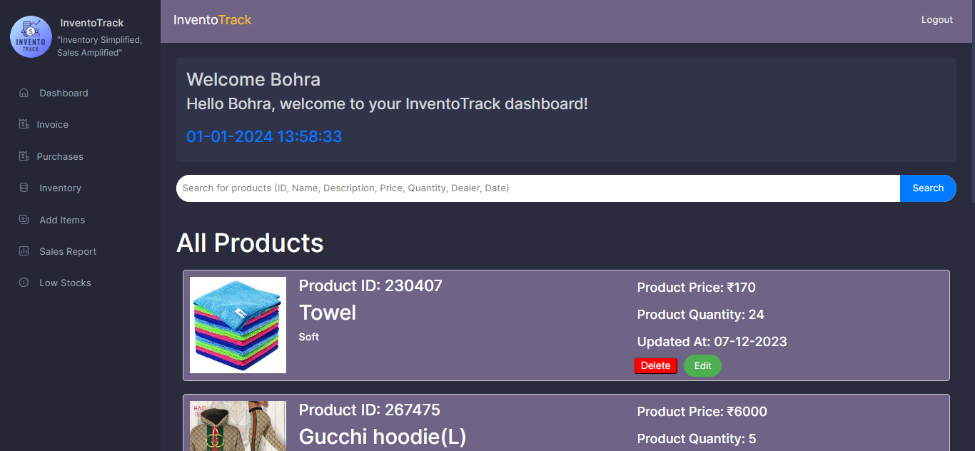 "Invento Track offers a comprehensive inventory management system designed for efficiency. Generate detailed invoices seamlessly, ensuring accurate transaction records. Visualize your business performance with insightful graphs, providing valuable insights for strategic decision-making. Streamline your purchasing process with intuitive tools that simplify order management. Monitor sales effortlessly through detailed reports, empowering you to optimize your business operations for success."